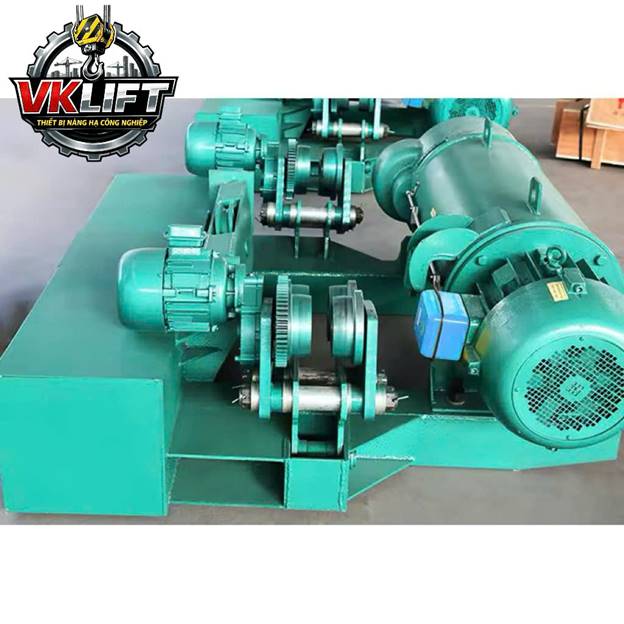 Cơ cấu di chuyển ngang sử dụng hai động cơ công suất 0.8 kW, giúp tời di chuyển êm ái, ổn định trên dầm cầu trục với tốc độ 20 m/phút, thuận tiện cho việc định vị tải trong quá trình sản xuất và lắp ráp.